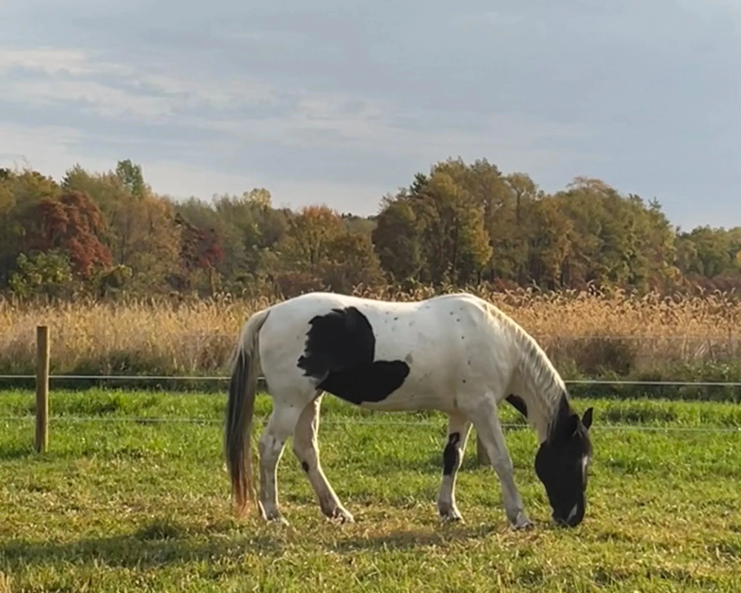 Midway through, a rustle in the treeline startled her. She surged forward, neck high, body on alert. My own body startled too. Instead of restraining either of us, I chose to stay with her. We moved through the big trot, I rubbed her neck, breathed, and stayed in conversation with her body.